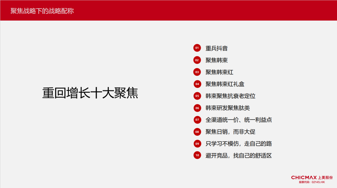 上美股份创始人兼CEO吕义雄也曾公开分享过上美重回增长的十大聚焦,其中就有提到“聚焦韩束、聚焦韩束红”。