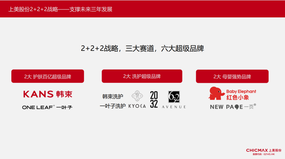即在未来三年内,上美将遵循“2+2+2”战略,聚焦护肤、洗护、母婴三大赛道,成就2大护肤百亿超级品牌,2大洗护超级品牌,以及2大母婴强势品牌。