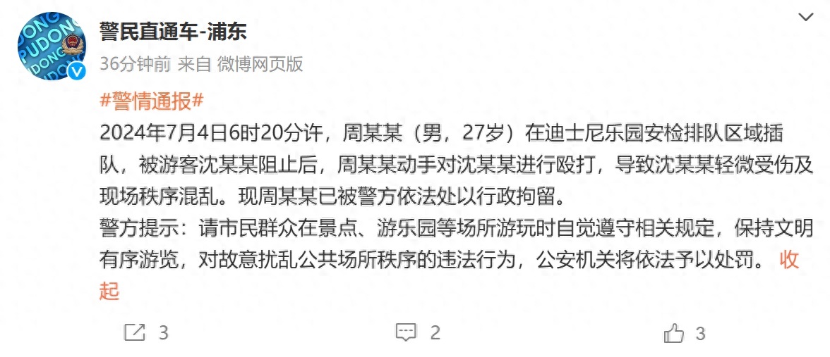 通报称,7月4日6时20分许,周某某(男,27岁)在迪士尼乐园安检排队区域插队,被游客沈某某阻止后,周某某动手对沈某某进行殴打,导致沈某某轻微受伤及现场秩序混乱。现周某某已被警方依法处以行政拘留。