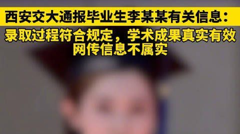 7月5日,西安交通大学发布通报:近期,网络上出现我校毕业生李某某同学的有关信息。学校高度重视,第一时间成立工作专班,全面启动调查工作并协助个人向公安机关报案。 经查实,李某某同学的录取过程符合规定,学术成果真实有效,所获荣誉和被推荐为毕业生代表程序符合规范要求,其指导教师不存在师德师风问题,网传信息不属实。我校将坚决维护师生合法权益,也感谢社会各界长期以来的关心支持。