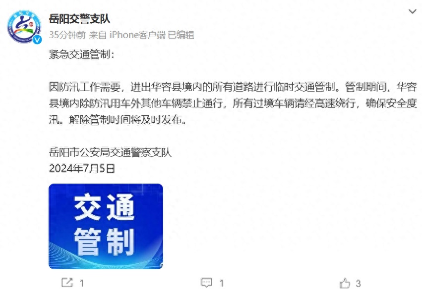 7月5日,湖南省岳阳市公安局交警支队发布紧急交通管制:因防汛工作需要,进出华容县境内的所有道路进行临时交通管制。管制期间,华容县境内除防汛用车外其他车辆禁止通行,所有过境车辆请经高速绕行,确保安全度汛。解除管制时间将及时发布。