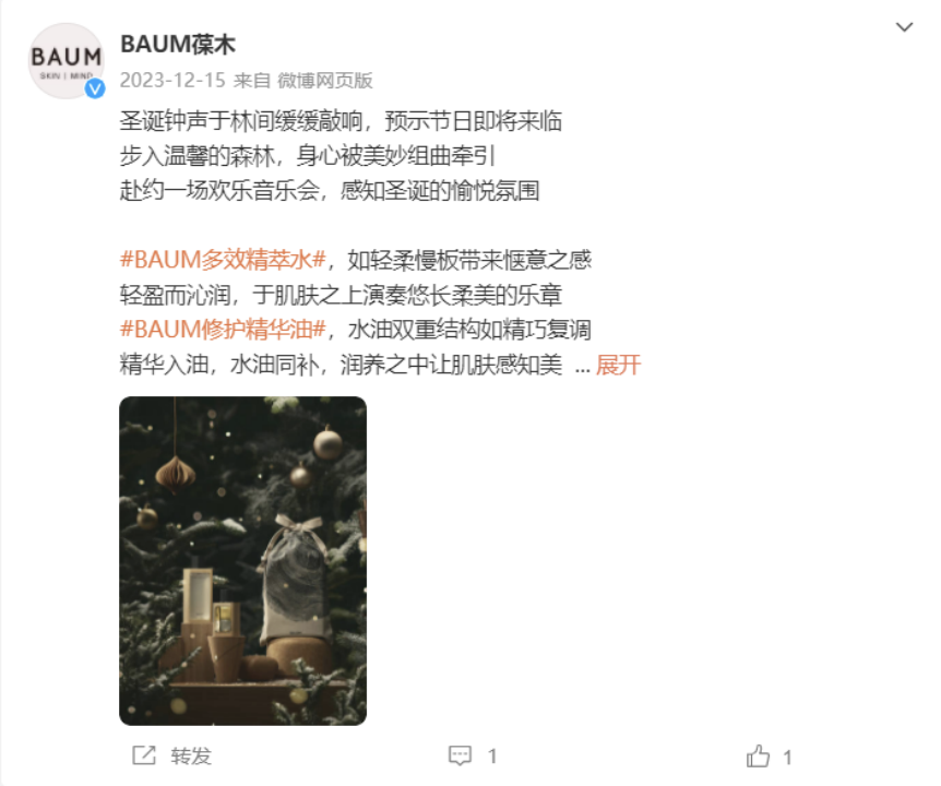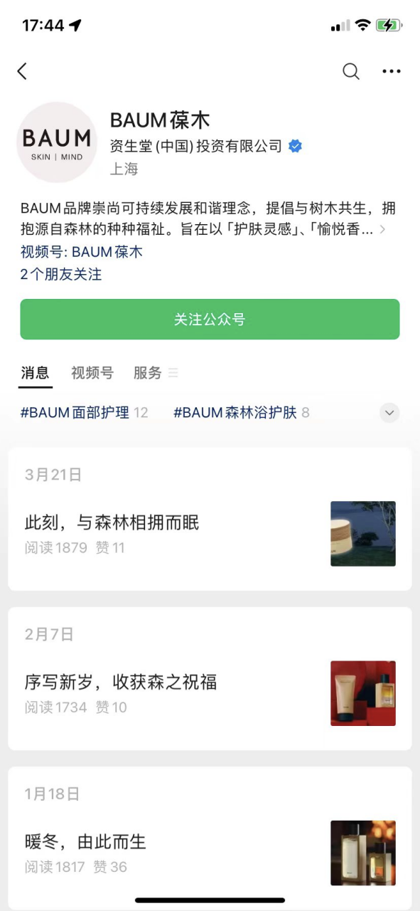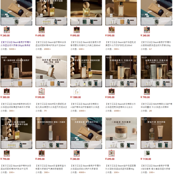 BAUM葆木是资生堂集团在2020年6月推出的高端护肤品牌,2021年10月登陆中国。BAUM围绕“树木”作为整个品牌的灵感起点,主张天然、无添加以及环保、亲近自然的理念,选用高达90%以上的天然原料进行制作。其品类涵盖卸妆、洁面、精华、水乳、香氛等产品,主打产品定价在240元至900元之间。