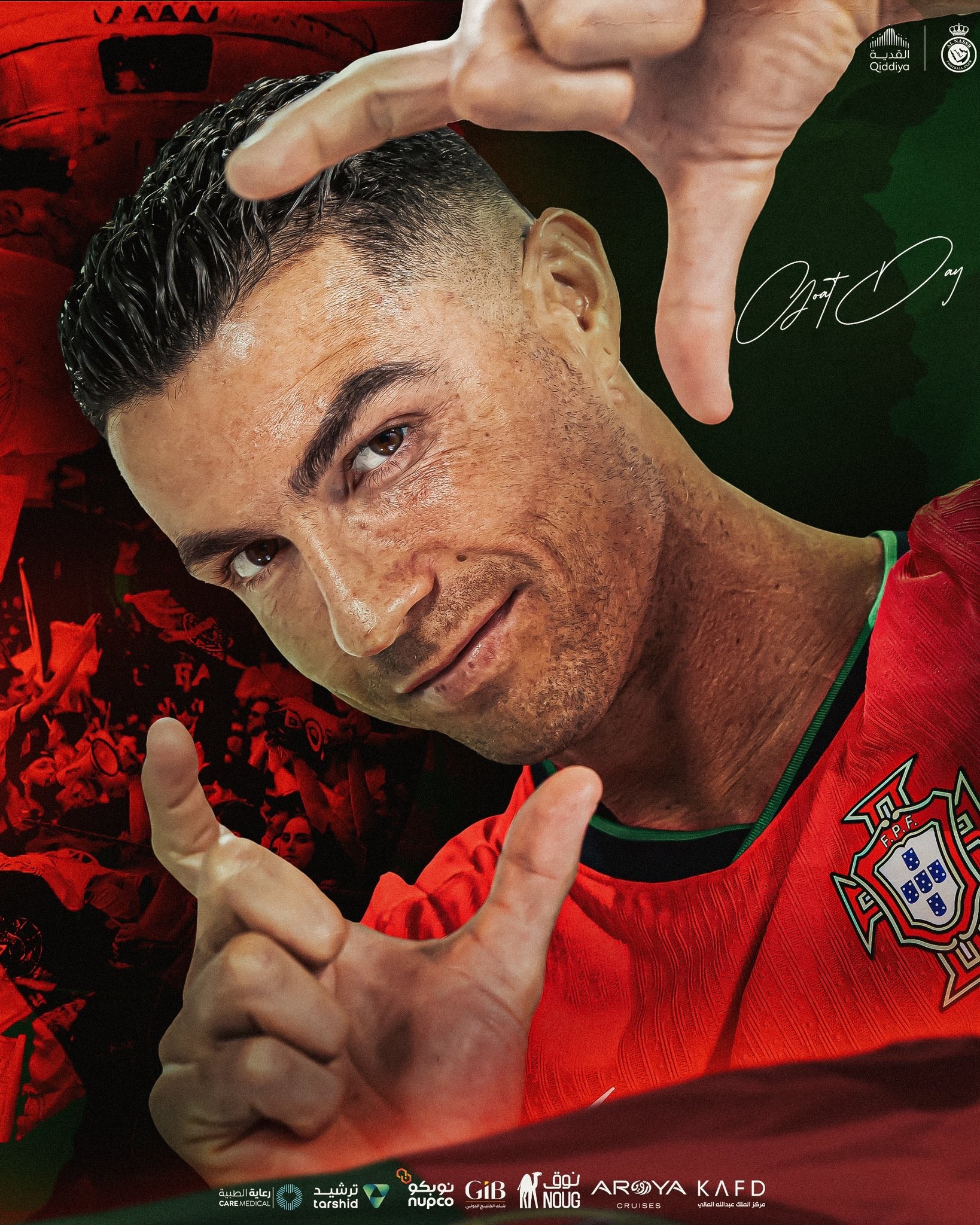 2024年欧洲杯1/4决赛,葡萄牙队将对阵法国队,赛前,利雅得胜利官方发布海报为C罗加油。