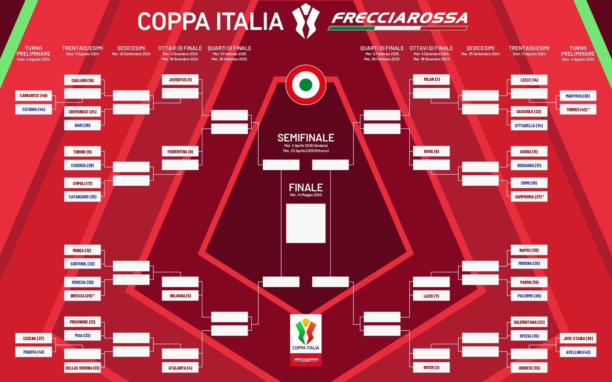 除了上述这8支球队以外,其余的12支意甲球队将会从32强战开始踢起,上半区的意甲球队还包括了卡利亚里、都灵、恩波利、蒙扎、威尼斯、维罗纳,下半区则包括了莱切、热那亚、科莫、那不勒斯、帕尔马以及乌迪内斯。