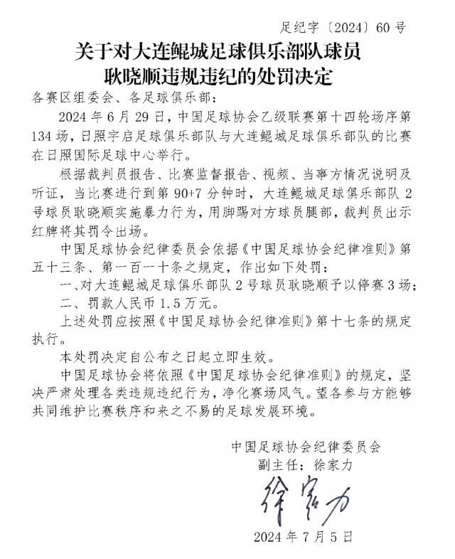 中国足协官方公布了对大连鲲城球员耿晓顺违规违纪的处罚决定:耿晓顺实施暴力行为,用脚踢对方球员腿部,被红牌罚出场,予以停赛3场、罚款人民币1.5万元。