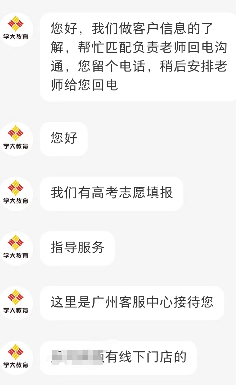 在记者表示需要志愿填报指导后,对方立刻肯定:“可以的。”并且要求留下电话联系方式。可留下信息后,记者却并未收到对应的联络电话与微信。