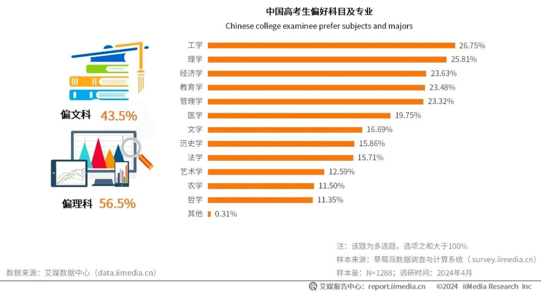 艾媒咨询在2024年出了一份有关“中国高考志愿填报及就业前景大数据的分析报告”,报告显示,中国高考意向所学科目较偏理科(56.5%),偏好专业前三分别为26.75%的工学、25.81%的理学和23.63%的经济学。