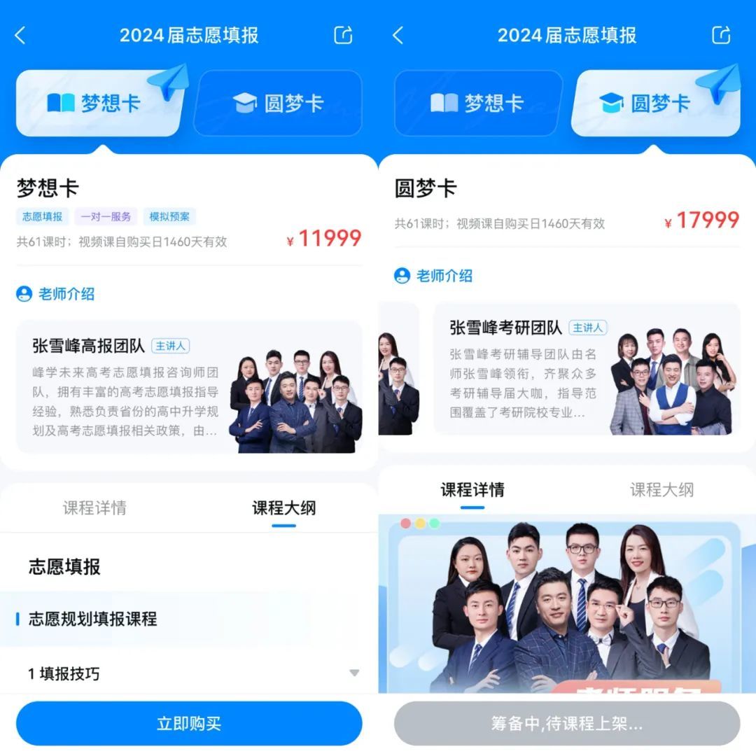 现在也是如此。2024年,“峰学未来”推出的“梦想卡”服务内容,包括四次专业填报沟通、志愿规划视频等,可服务老师皆是张雪峰团队随机分配,且不接受7天无理由退款。