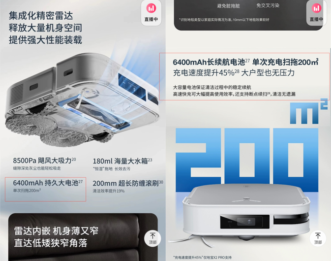 该商家在详情页宣称该产品配备了“6400mAh持久大电池”,产品“单次扫拖200平方米”且“大容量电池保证清洁过程中的稳定续航”。史女士表示,现实情况是单次扫拖86平方米就出现电量不足的情况。截至目前,上述问题仍未得到有效解决。