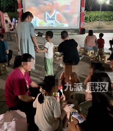 7月6日,武汉琴园小区重现了这一时代场景,在广场上拉起幕布,架好投影仪,为小区居民放映了一场篮球赛。九派新闻记者来到现场,同居民一起感受露天看球赛的氛围。