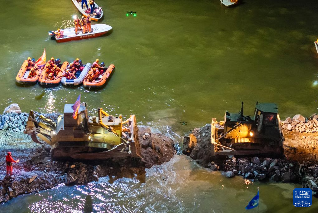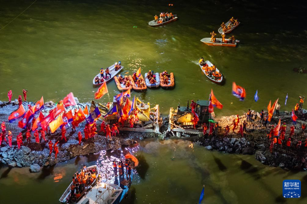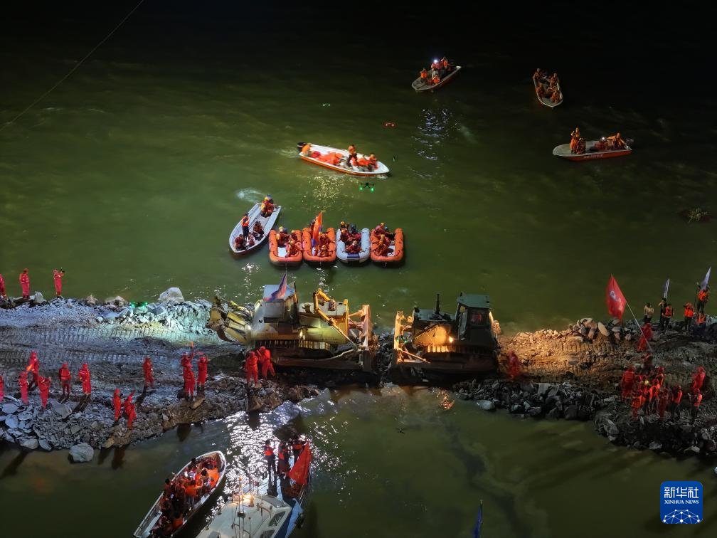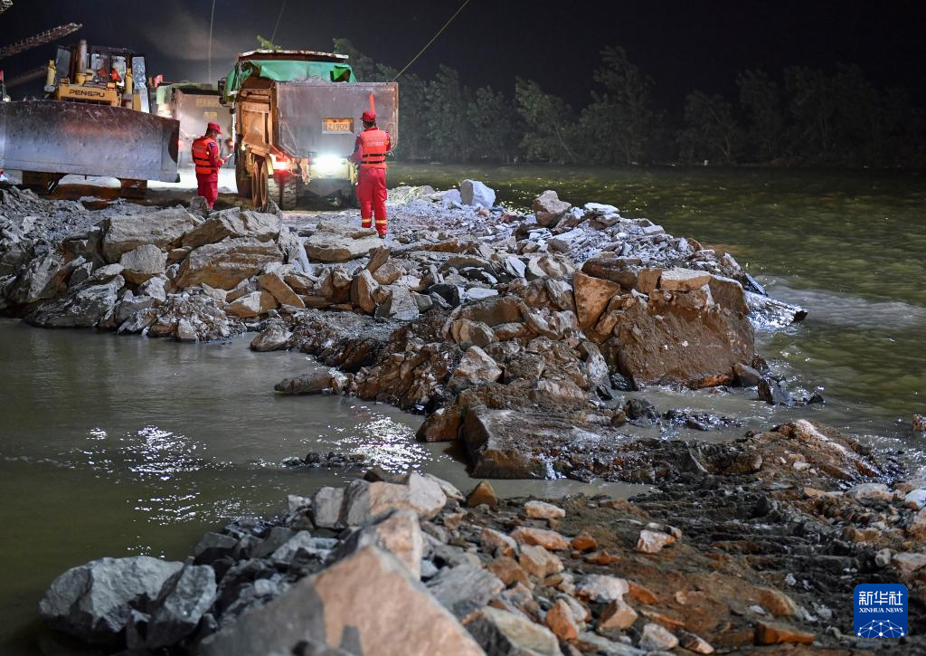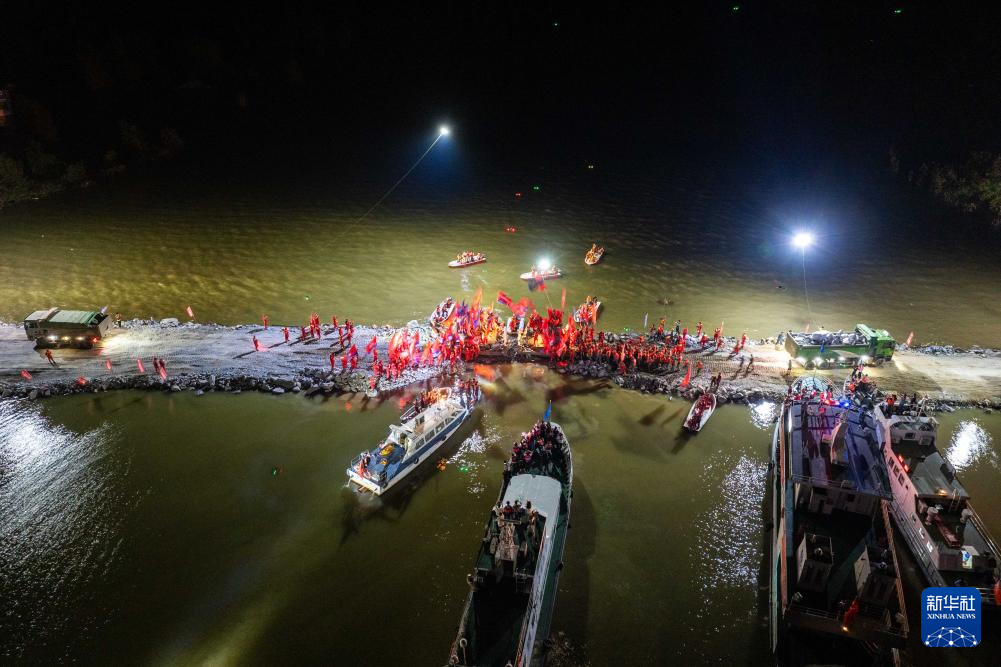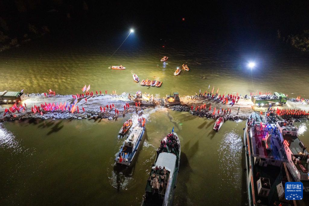 这是7月8日晚拍摄的团洲垸洞庭湖大堤决口封堵现场(无人机照片)。