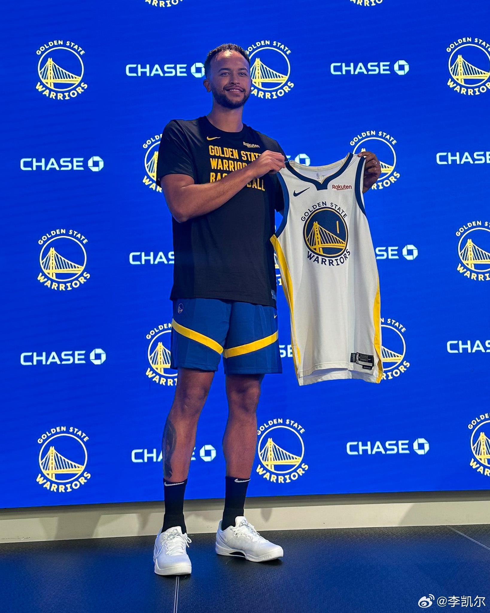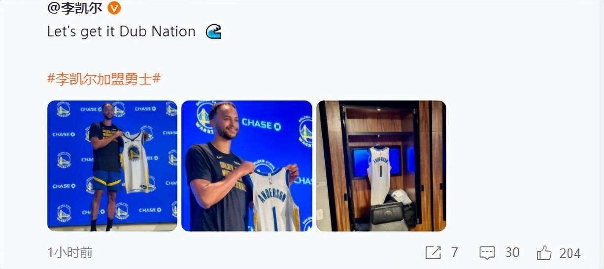 李凯尔也晒出三张勇士球衣的照片,写道:“Let's get it Dub Nation”。