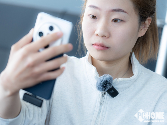 麦克风主体还有一些比较出色的设计细节,能照顾到录制者不同的创作情况。它的发射器非常贴心地采用了领夹式设计,能够舒适稳定佩戴。侧边位置有一枚单独的按键,其作用是在录音时遇到一些突发情况或者不想被收录的内容时,可以快速“闭麦”。这一点设计在其同级别的竞品中也确实不太容易见到,但确实是我们创作过程中会切实出现的情况,从这些小细节也能看得出来JBL在设计上的用心。