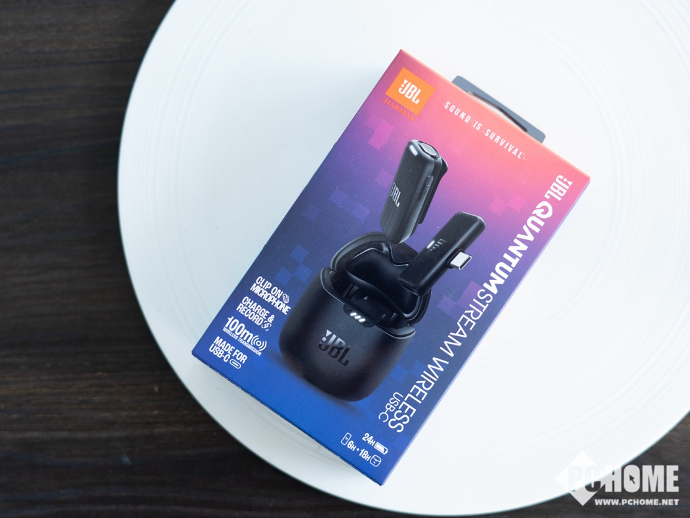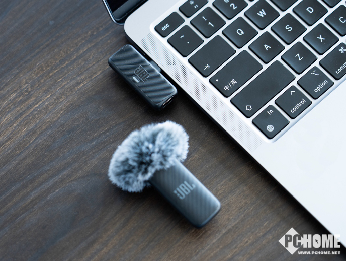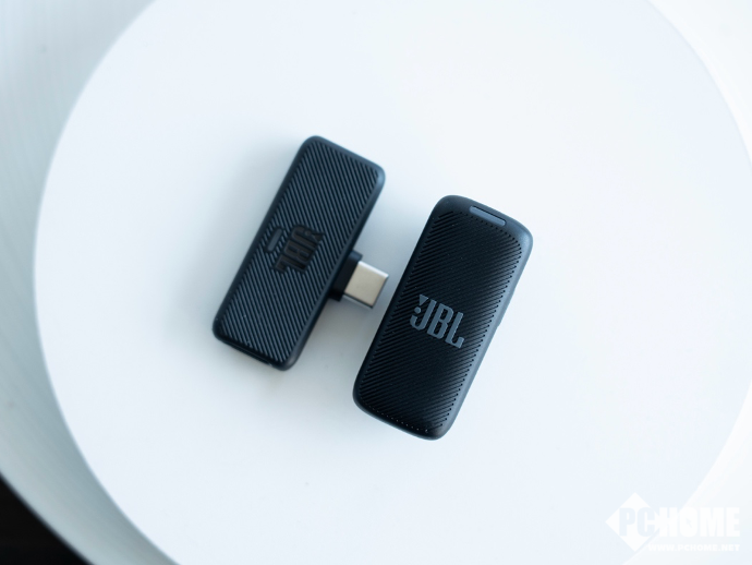 打开上盖之后,JBL风语者 无线麦克风的本体便显露出来,包括有一枚USB-C接口的接收器和麦克风主体,设计方面则是一如JBL简约的风格。