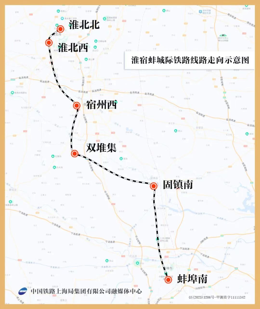 淮宿蚌城际铁路,线路起自淮北北站,沿途向南经淮北、宿州、蚌埠三市,终至京沪高铁、合蚌高铁共线车站蚌埠南站,正线全长约161公里,设计时速350公里,沿线设淮北北、淮北西、宿州西、双堆集、固镇南、蚌埠南6座车站,其中,淮北北站、蚌埠南站为既有车站。淮宿蚌城际铁路建成运营后,将成为皖北城市群连接合肥都市圈及长三角地区的便捷通道,对于完善区域城际快速铁路网,密切皖北城市群与合肥都市圈的联系,促进区域经济协同发展等具有重要意义。
