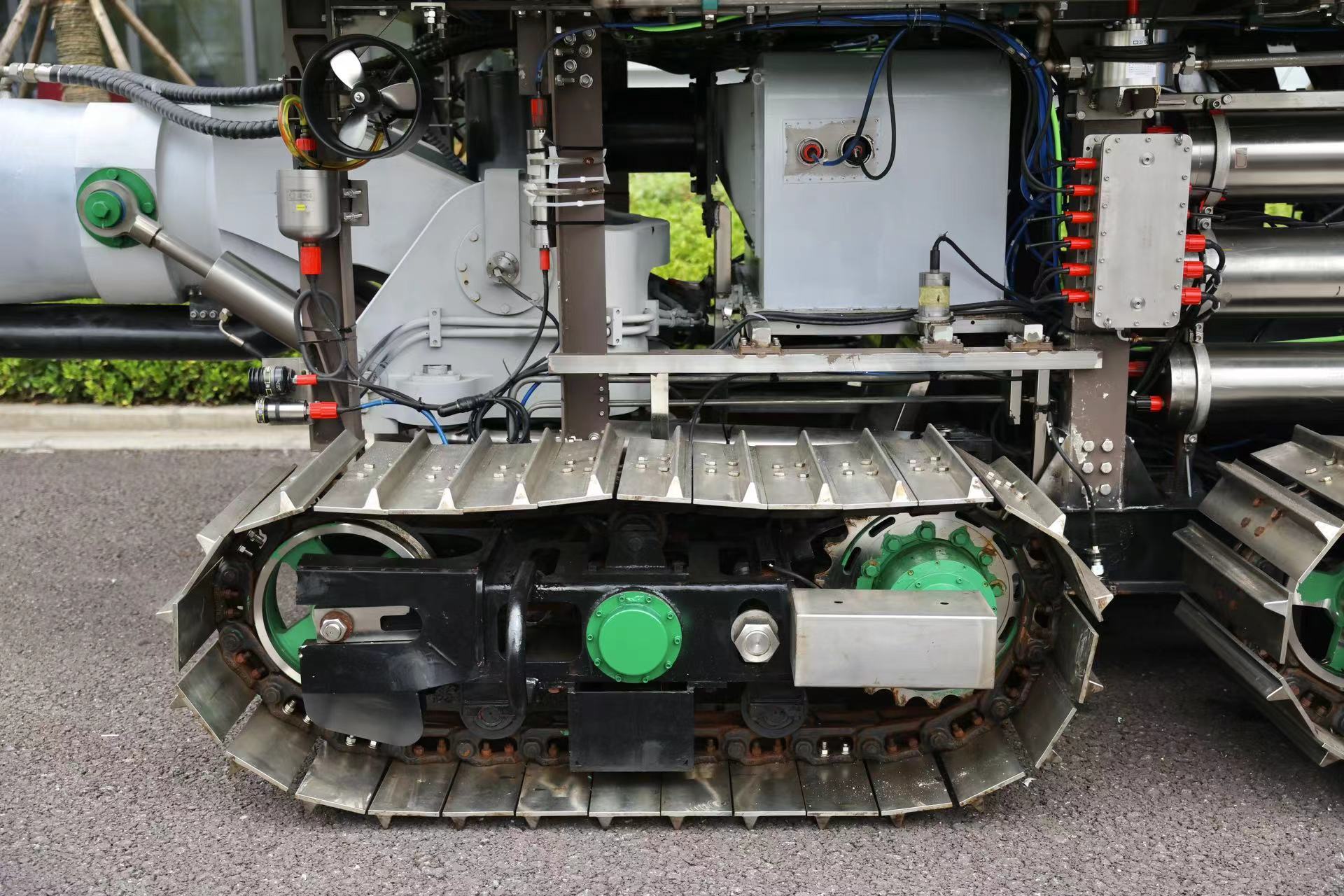 长6米、宽3米、高2.5米,车前装备有一根巨大的钻头,单从外观看,“开拓二号”就是一台“平平无奇”的采矿车。但如将其放入海底,无论是坡度达30多度的陡峭海山,还是由高粘性稀软沉积物堆积的海底“滩涂”,“开拓二号”都能如履平地——秘诀就在它的四条履带上。