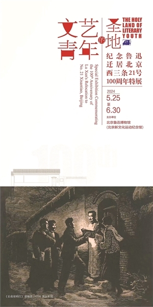 主题墙上,一幅巨大的木刻版画扑面而来,画面呈现出一个漫漫长夜,房檐上结着长长的冰凌,表明当时寒凝大地的自然环境和社会氛围。鲁迅先生手里拿着煤油灯,站在台阶上迎送青年。“这幅馆藏艺术品是邬继德1975年创作的黑白木刻《长夜有明灯》。画面上,男青年手里拿的《莽原》周刊是鲁迅在西三条21号第一次主编的文学批评刊物,女青年手里拿的是鲁迅的第一部小说集《呐喊》,这个煤油灯的光源就像中国新文学的光源,照亮了他们迷惘、求索的心灵,文艺青年的眼睛里流露出希冀的光芒。”姜异新动情地说。