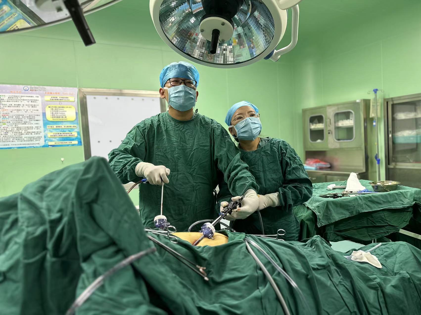 翁昊(左)实施腹腔镜胆囊切除手术。