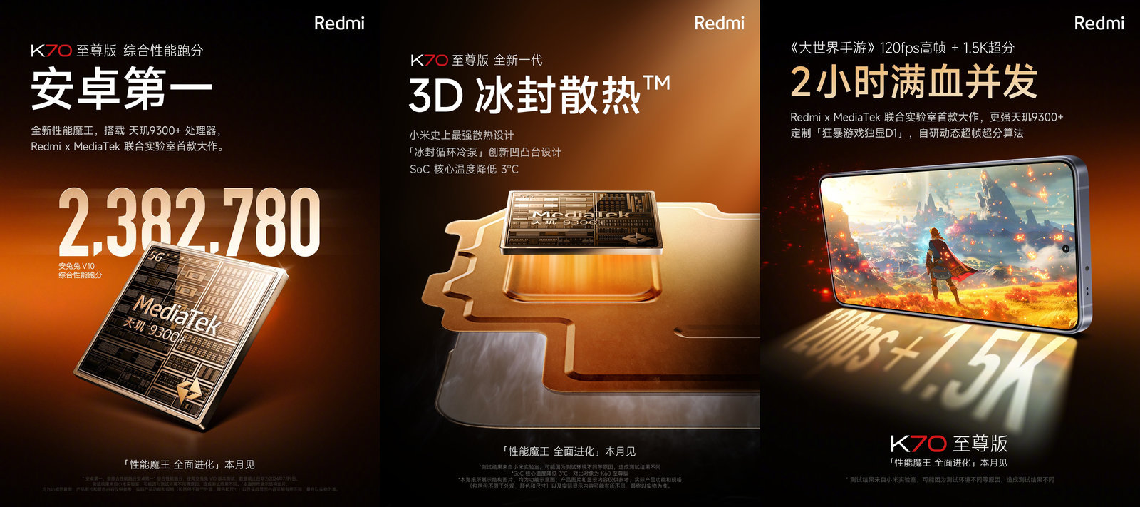 同日,Redmi K70 至尊版的部分性能配置也正式公开,其会搭载联发科天玑 9300+ 旗舰芯片与狂暴游戏独显 D1,搭配 3D 冰封散热,据称可以做到 238 万以上的安兔兔跑分。同时,官方还公开了它的官方性能实测结果,表示可以在 120fps 高帧+1.5K 超分的设置下,实现 2 小时“满血并发”。我们也在今天公开了这款新机的部分性能测试,感兴趣的朋友也可以去看看。