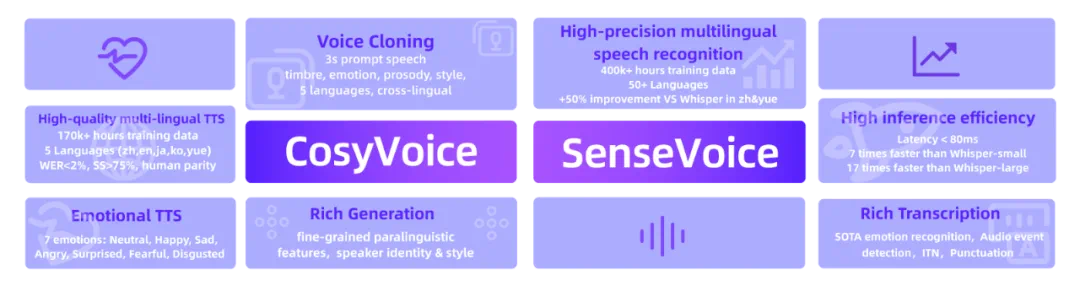 阿里发布超强语音处理模型FunAudioLLM,是一个旨在增强人与大语言模型 (LLMs) 之间自然语音交互的框架。其核心包括两个创新模型:SenseVoice和CosyVoice。