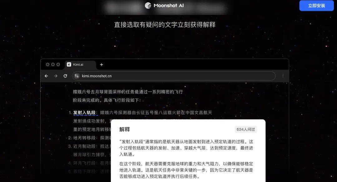 点问笔:划选文字后就会出现,Kimi 插件会在理解上下文的基础上,结合具体场景,帮用户更好理解一个术语、一个名字、一句话;而不是简单地搜索和重组信息。