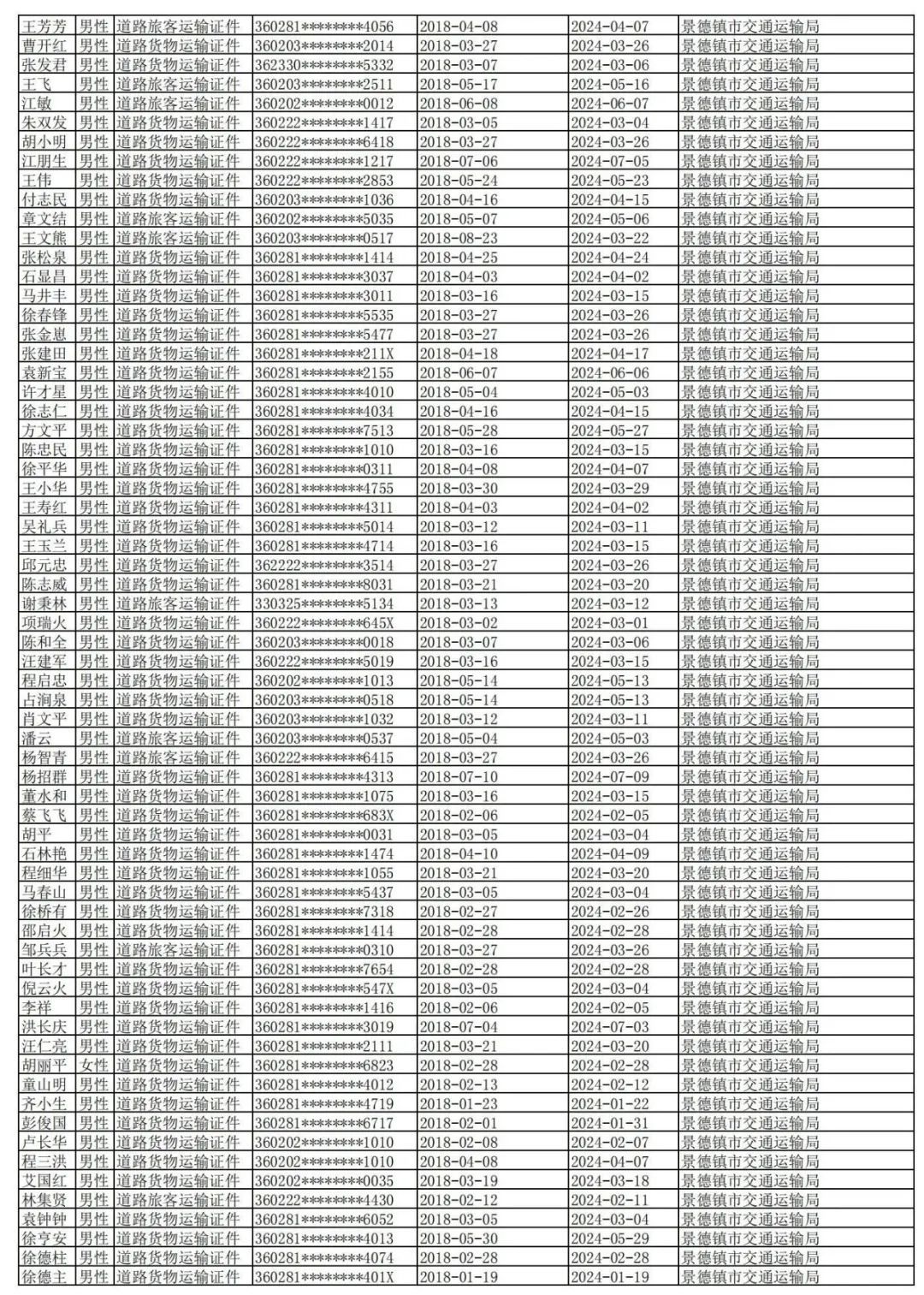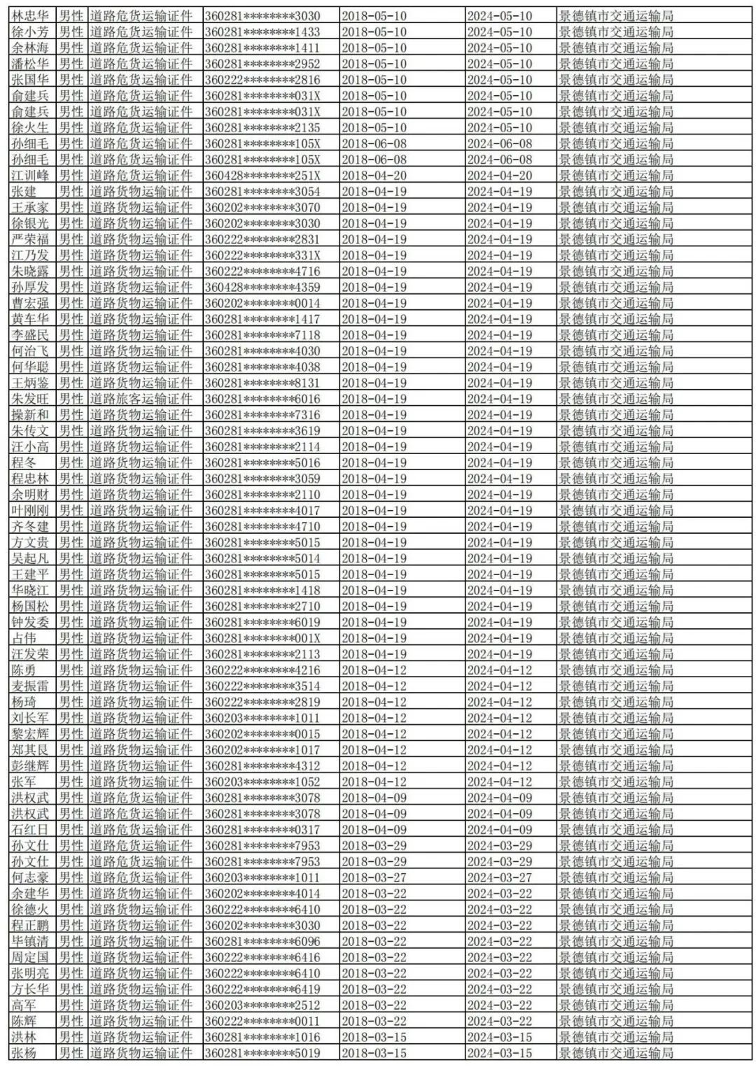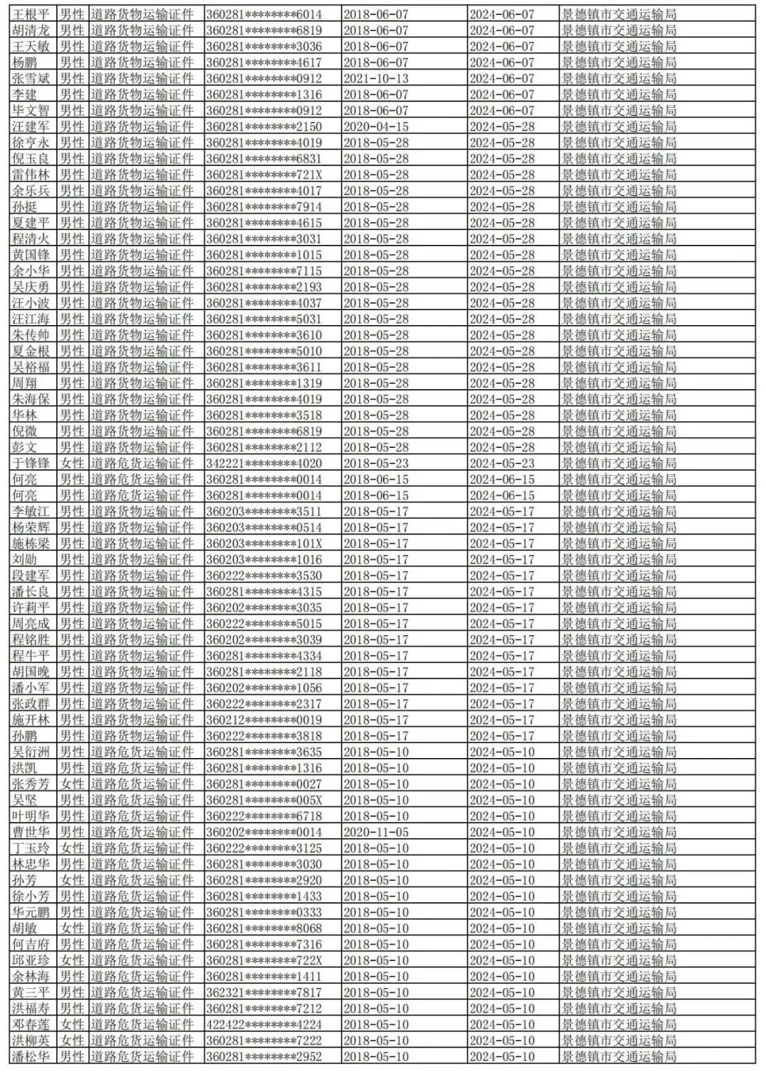 截至2024年7月10日,共有以下417名道路运输从业人员的《从业资格证》已逾期但未超过180天,请相关人员立即前往市政务服务中心交通窗口或通过“道路运政一网通办”平台办理换证手续。在规定时间内未办理相关手续的从业人员,交通运输部门将按《道路运输从业人员管理规定》对证件进行注销。