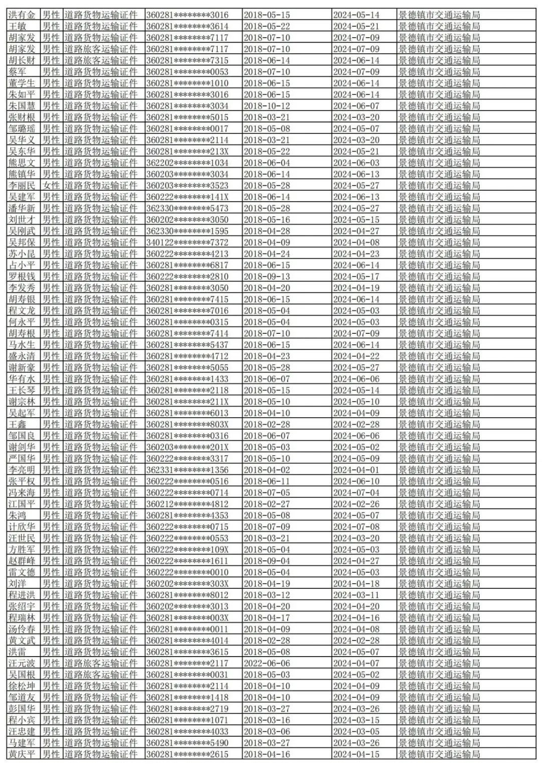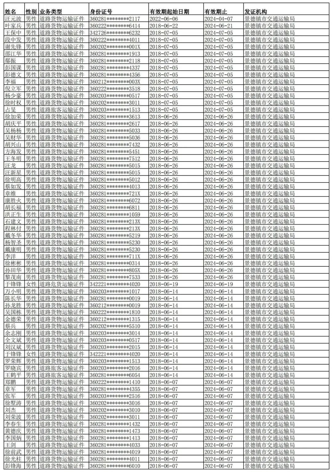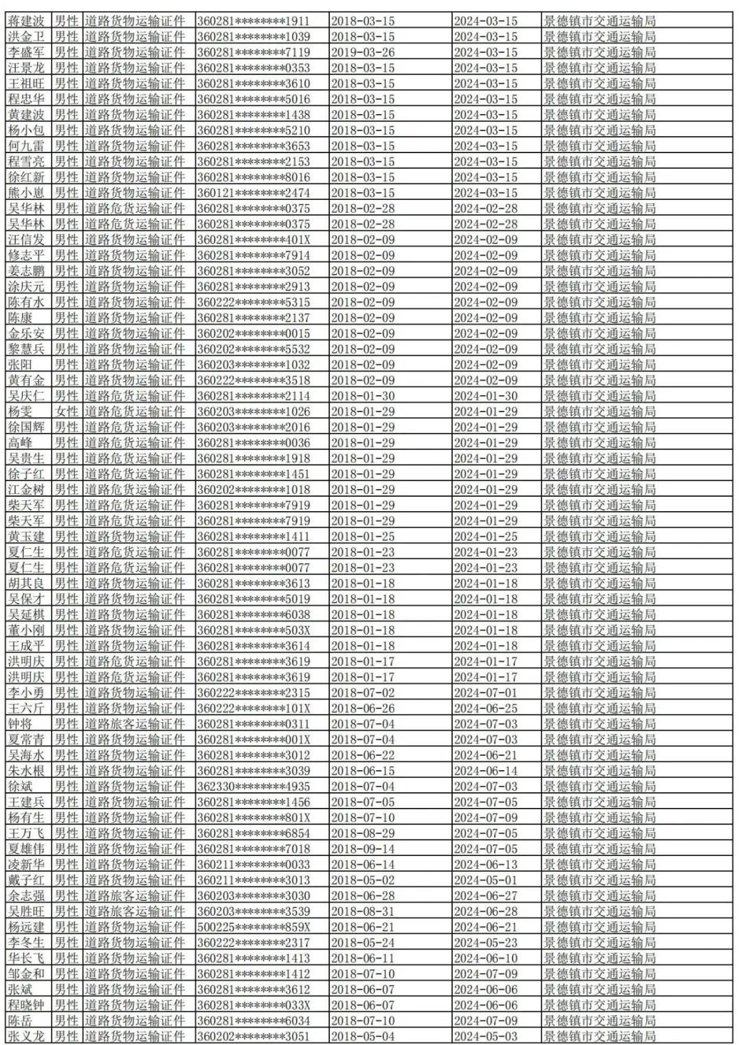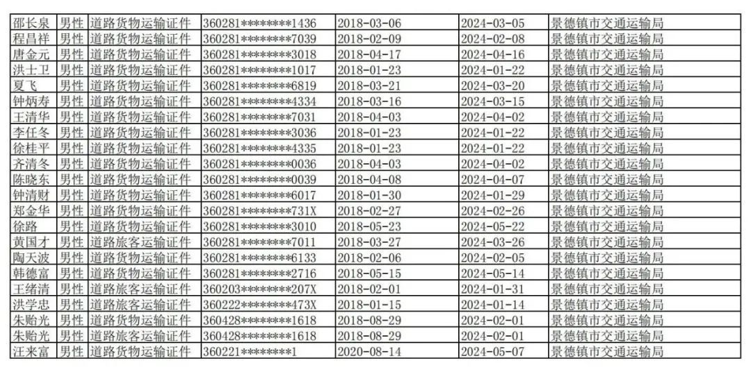 截至2024年7月10日,共有以下417名道路运输从业人员的《从业资格证》已逾期但未超过180天,请相关人员立即前往市政务服务中心交通窗口或通过“道路运政一网通办”平台办理换证手续。在规定时间内未办理相关手续的从业人员,交通运输部门将按《道路运输从业人员管理规定》对证件进行注销。