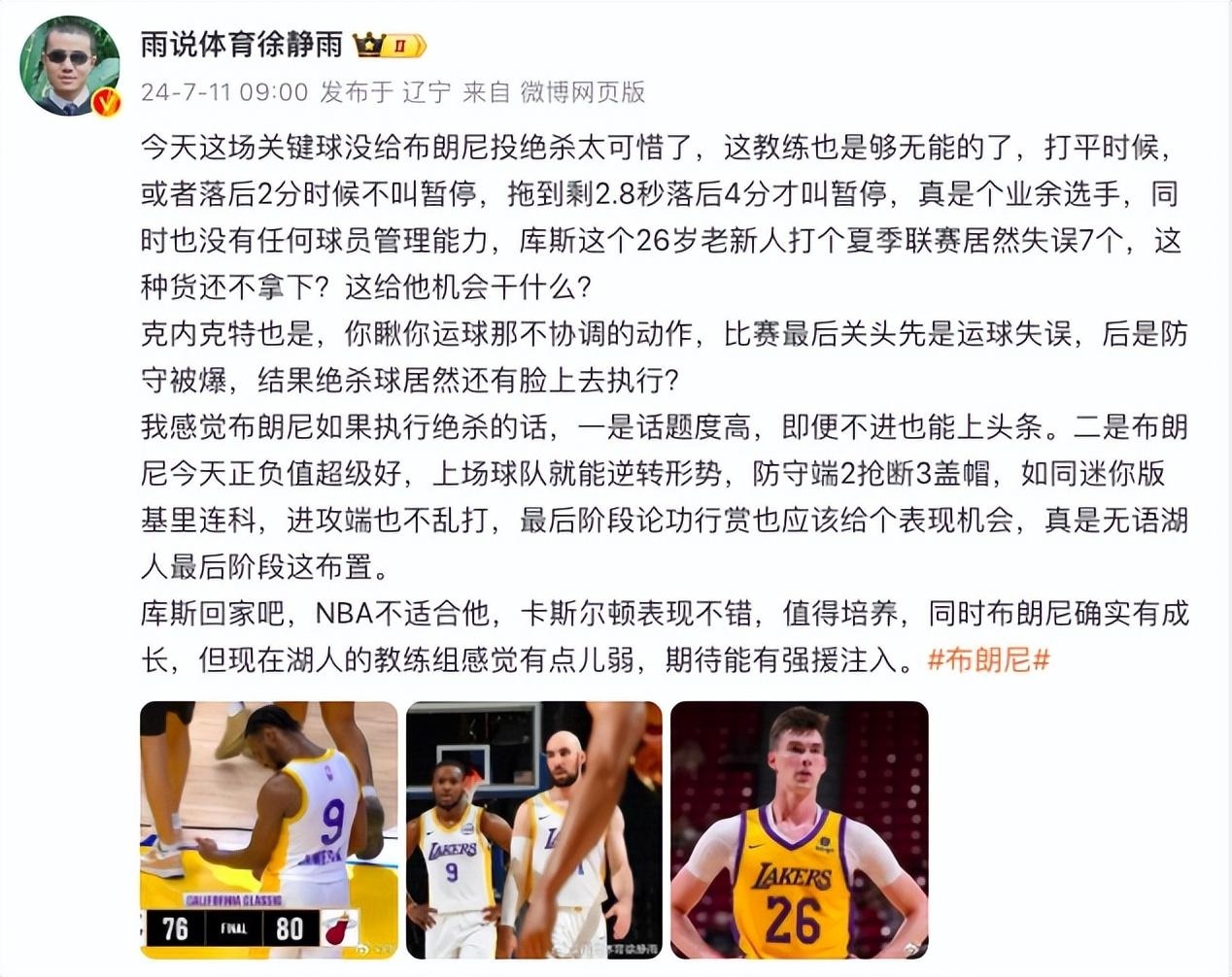 对此,徐静雨发表看法:“今天这场关键球没给布朗尼投绝杀太可惜了,我感觉布朗尼如果执行绝杀的话,一是话题度高,即便不进也能上头条。二是布朗尼今天正负值超级好,上场球队就能逆转形势,防守端2抢断3盖帽,如同迷你版基里连科,进攻端也不乱打,最后阶段论功行赏也应该给个表现机会,真是无语湖人最后阶段这布置。”