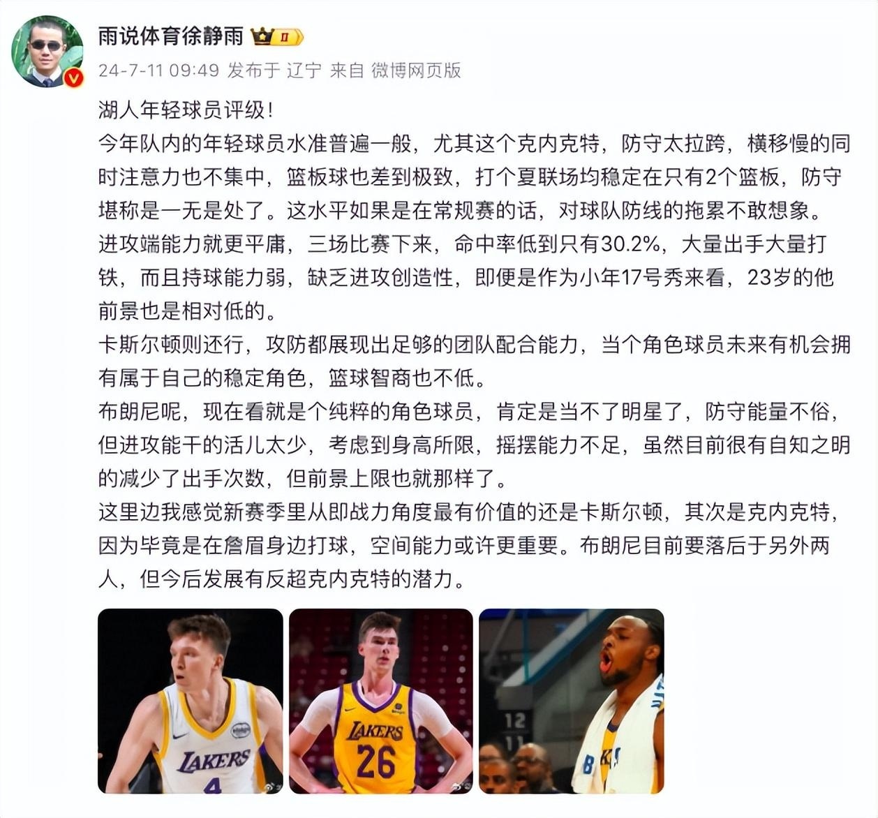 此外,徐静雨还对湖人的年轻球员进行了评价。“从战力角度最有价值的还是卡斯尔顿,其次是克内克特,因为毕竟是在詹眉身边打球,空间能力或许更重要。布朗尼目前要落后于另外两人,但今后发展有反超克内克特的潜力。”