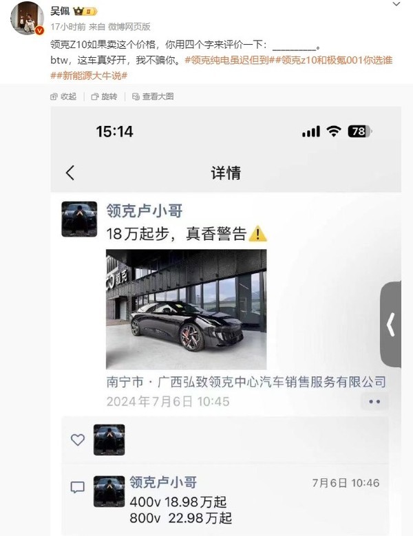 近日,有汽车博主放出了疑似销售曝光的领克Z10价格。根据这名来自广西南宁某领克中心的员工的爆料,领克Z10 400V版本的起售价为18.98万元,而800V版本的起售价为22.98万元。该员工还表示“18万元起步,真香警告”,疑似暗示首销期间可能还会有更多权益。