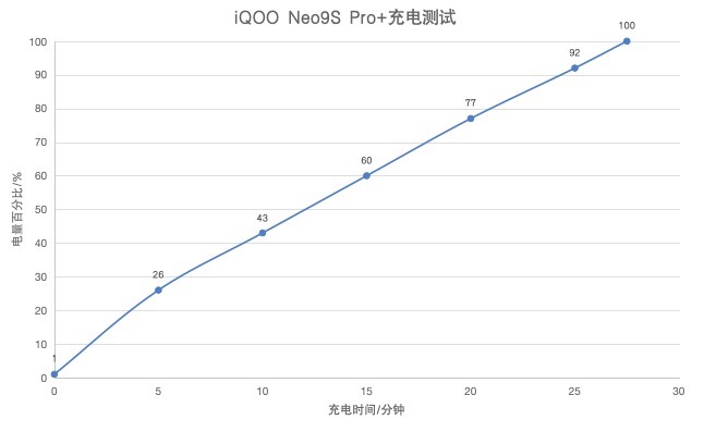最后我们进行充电测试,将手机从1%的低电量充至100%满电状态,耗时27分钟左右,充电速率也是符合预期。综合来看,iQOO Neo9S Pro+的这套续航组合,非常适合有长时间游戏需求的玩家,续航足够长,回血足够快,握持又舒适,游戏体验直接拉满了。