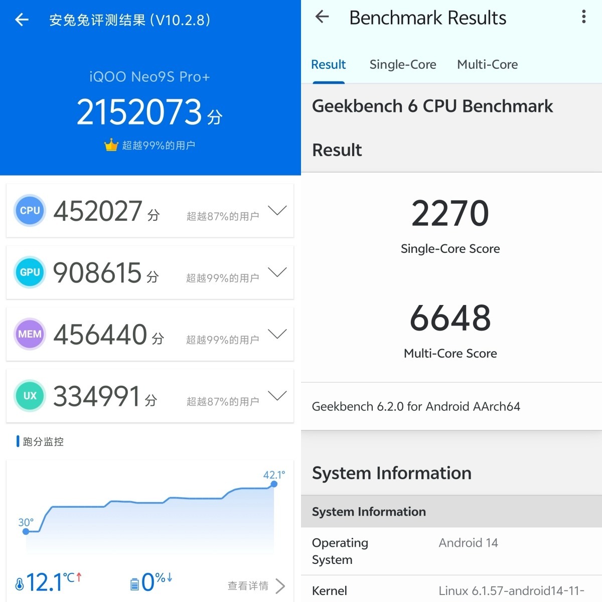 基准性能测试中,安兔兔跑分成绩高达215万分;GeekBench跑分,单核2270分,多核6648分。从跑分成绩来看,芯片调校成果不错,完全能够发挥出双芯的基准性能,日常使用场景下不用担心性能不足问题。