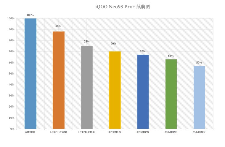 经过4小时的重度续航测试,iQOO Neo9S Pro+还能剩余57%的电量。其中,2小时的游戏耗电量仅25%,大容量电池与芯片优异调校的优势一览无遗,整机续航能力非常出色。
