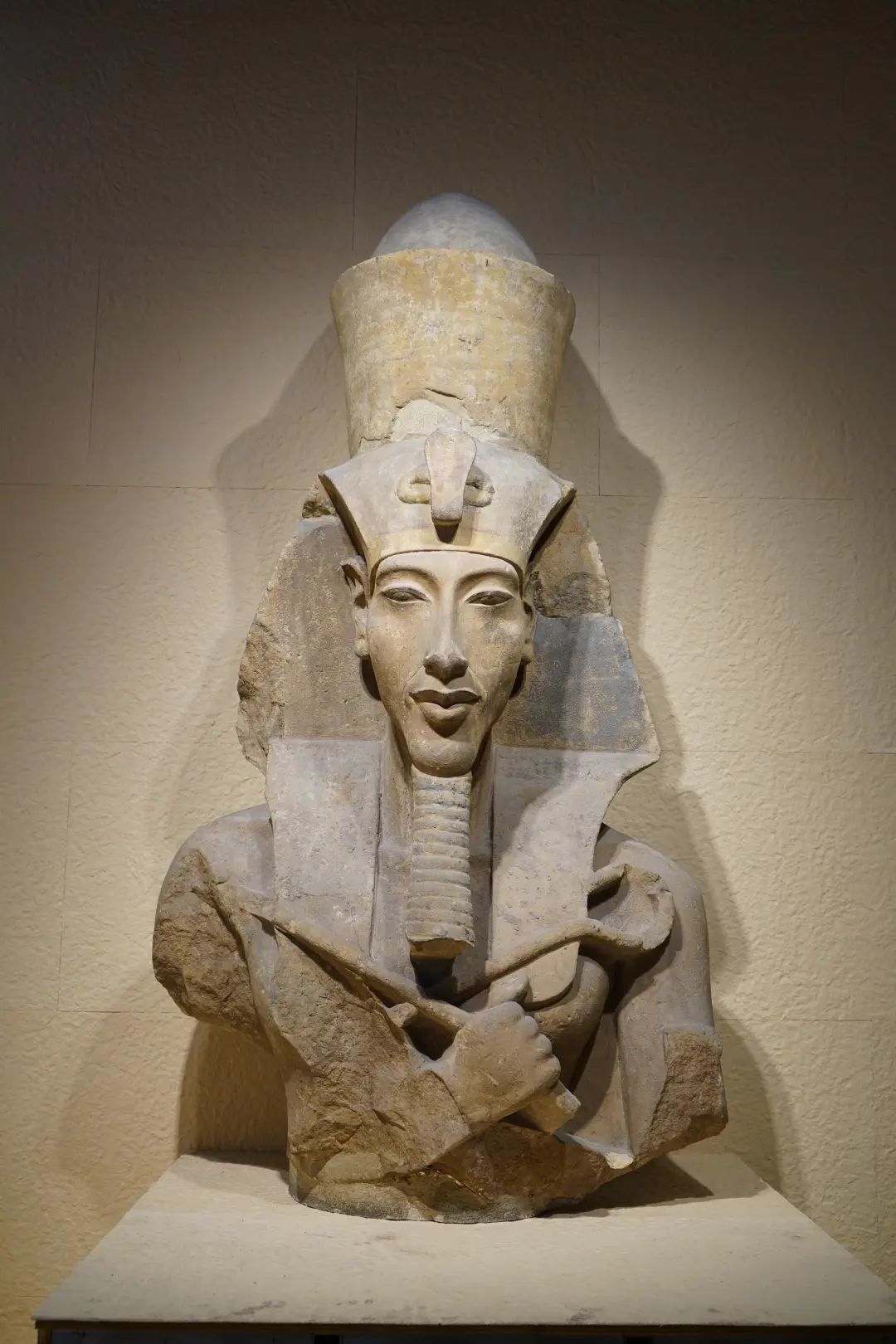 展厅现场可以看到,图坦卡蒙石英岩雕像面容平和眼神坚定,与其父埃赫纳吞巨像神秘迷离的表情形成对比。“古王国、中王国时期的法老雕像非常古板,五官是概念化的,肚子平平,姿势统一,但是图坦卡蒙石英岩雕像是写实的,尽管脸有所残缺,但是它像真人一样栩栩如生,不仅有胸肌腹肌,还有‘小肚子’,这是自然的表现,也让他从神性走向了人性。”