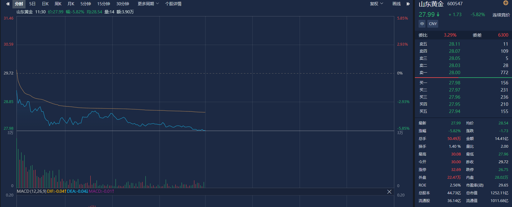 7月12日,贵金属板块高开后快速下挫,山东黄金领跌其他成分股,截至午间收盘,山东黄金放量大跌5.82%,成交额14.41亿元,报27.99元/股。