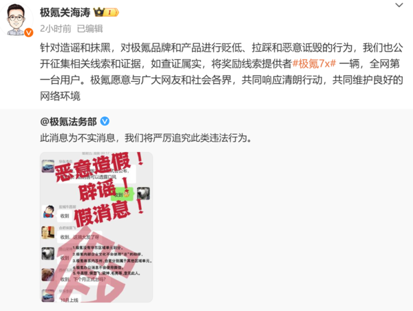 不久后,极氪智能科技CMO关海涛转发了上述内容,其同时表示:“针对造谣和抹黑,对极氪品牌和产品进行贬低、拉踩和恶意诋毁的行为,我们也公开征集相关线索和证据,如查证属实,将奖励线索提供者极氪7X一辆,全网第一台用户。极氪愿意与广大网友和社会各界,共同响应清朗行动,共同维护良好的网络环境。”由此可见,极氪对于近期不断出现的谣言已经忍无可忍了,开出了不小的条件用于征集线索。