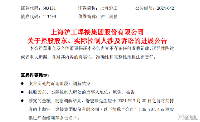 7月12日晚,上海沪工公告,近日收到舒宏瑞先生和缪莉萍女士的通知,经法院调解,双方已解除婚姻关系,并就离婚财产分割事宜作出相关安排。舒宏瑞应于7月30日之前将其持有的公司3970.75万股股票(占公司总股本的12.49%)过户至缪莉萍名下。按7月12日收盘价计算,上述股份价值超5亿元。舒宏瑞与缪莉萍离婚之后,二者的儿子舒振宇将成为公司的控股股东。