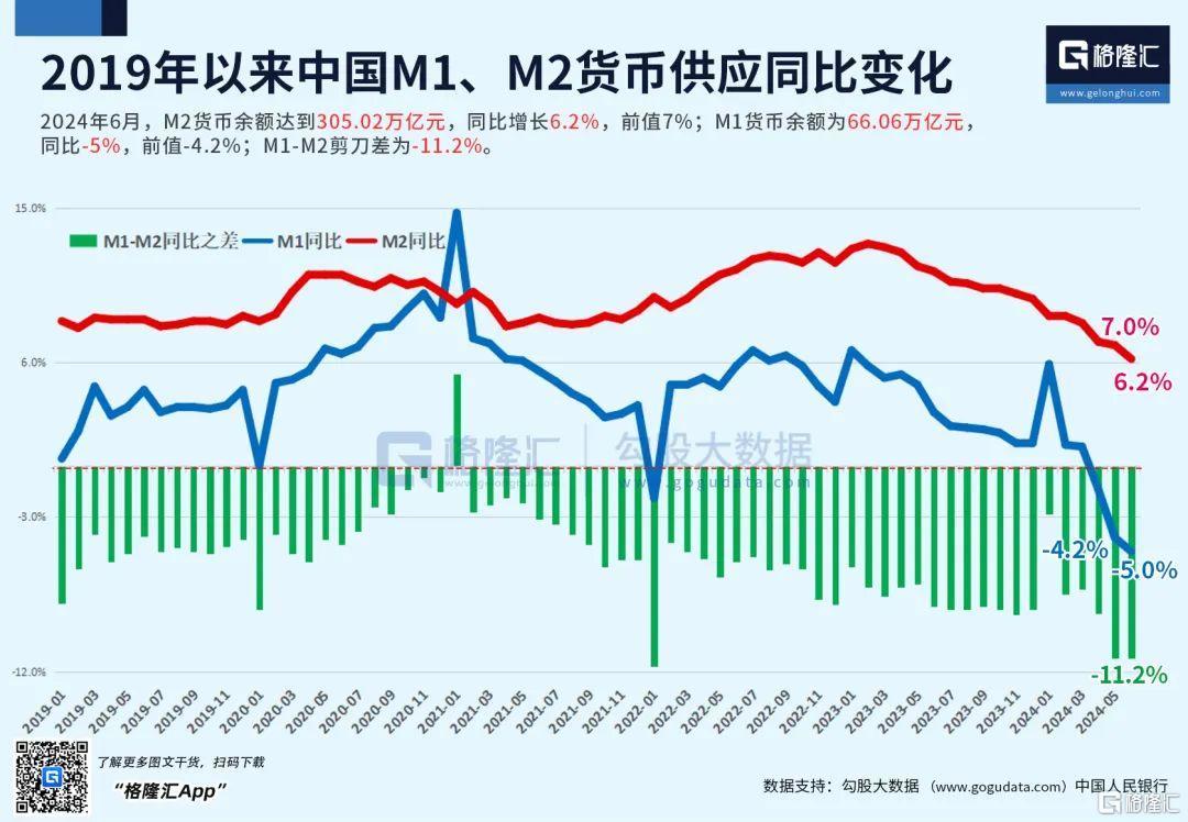 7月12日,人民银行公布的最新金融数据显示,6月末广义货币(M2)同比增长6.2%;狭义货币(M1)同比下降5%。社融方面,6月末社会融资规模存量为395.11万亿元,同比增长8.1%。其中,对实体经济发放的人民币贷款余额为247.93万亿元,同比增长8.3%。2024年上半年社会融资规模增量为18.1万亿元,处于历史同期较高水平。