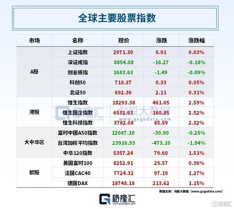 港股方面,恒指大幅收涨2.59%上扬461点,国指、恒生科技指数分别上涨2.52%及2.31%。大型科技股、内银股、内险股、中字头股等权重拉升助力大市上涨;港口及海运、黄金、半导体芯片等板块下挫。