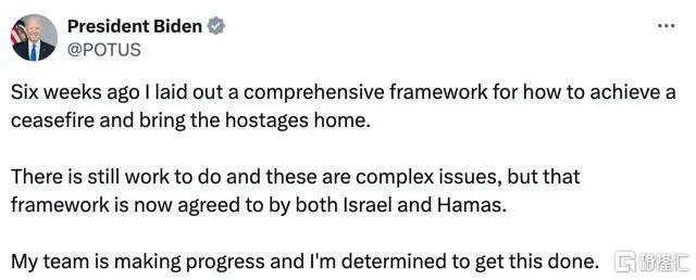 美国总统拜登在社交媒体上发帖称以色列和哈马斯同意停火框架。他表示,六个星期前制定了一个实现停火并将人质带回家的全面框架。他仍然有工作要做,并且这些问题很复杂,但现在以色列和哈马斯都同意了这个框架。团队正在取得进展,决心完成这项工作。