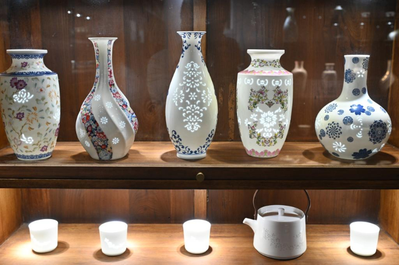 这是6月5日在江西景德镇一个创意瓷器作坊内拍摄的镂空技艺陶瓷作品。新华社记者刘天宇摄