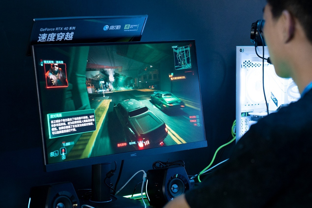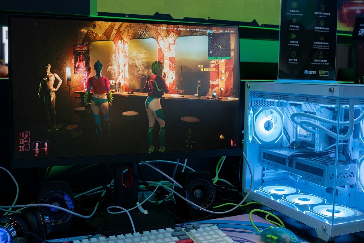 其中《赛博朋克2077》应该是其中最受玩家青睐的游戏,该游戏支持诸多NVIDIA RTX技术,在现场体验区,小伙伴们通过影驰GeForce RTX 40 系列显卡独有的NVIDIA DLSS 3.5技术的加持,轻松获得了高帧率高画质的流畅游戏体验!同时,该游戏还支持全景光线追踪技术,该技术的开启为小伙伴们提高画面质量,犹如身临其境般驰骋在夜之城!