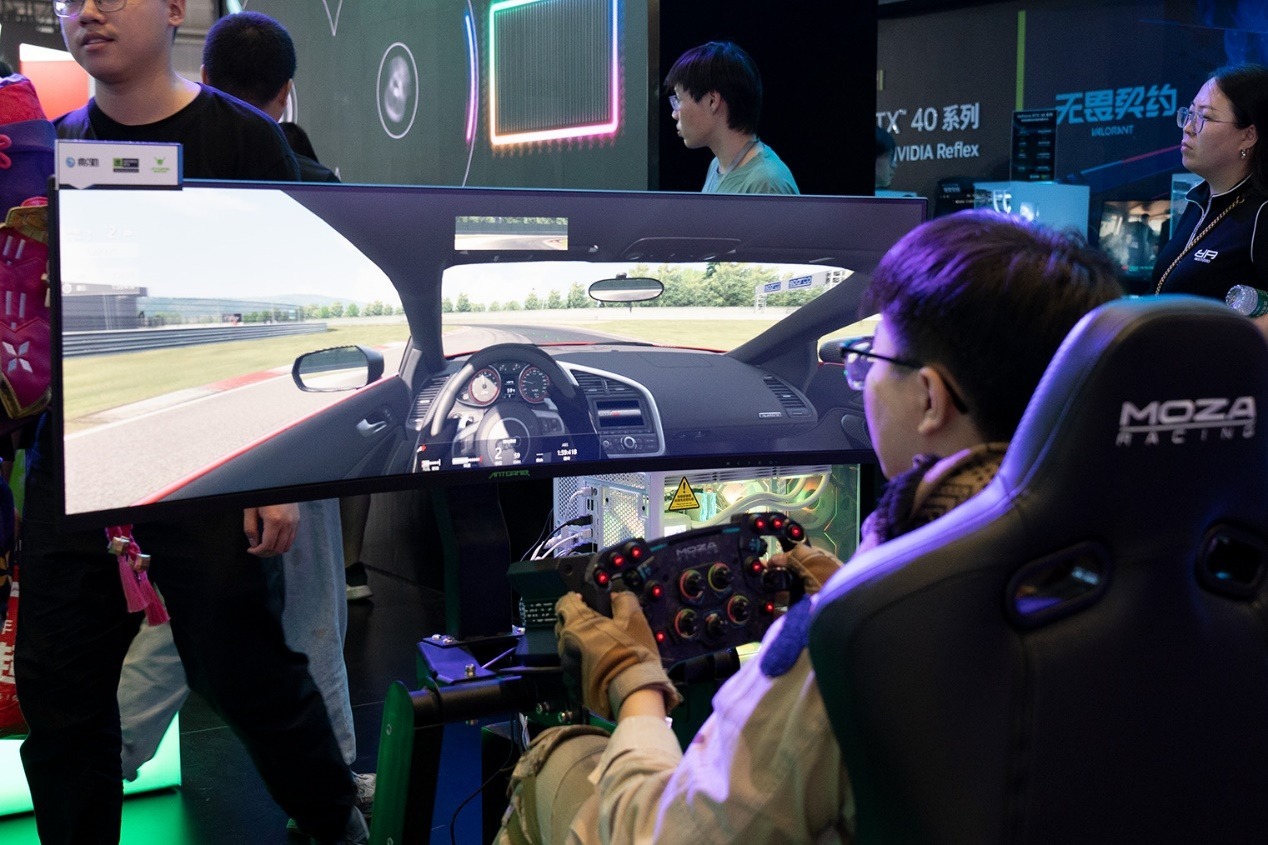 现场还有紧张刺激的赛车模拟器圈速赛挑战区,MOZA赛车模拟器搭配影驰高性能GeForce RTX 40系显卡,为玩家开启一场视觉与速度的双重盛宴。细腻的赛车画质搭配丝滑流畅的帧率,让玩家仿佛置身于真实的赛道之上,每一次加速都伴随着风驰电掣的极致快感。