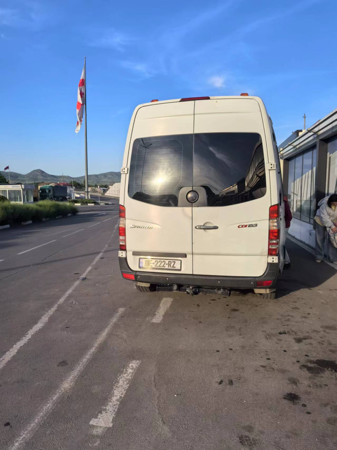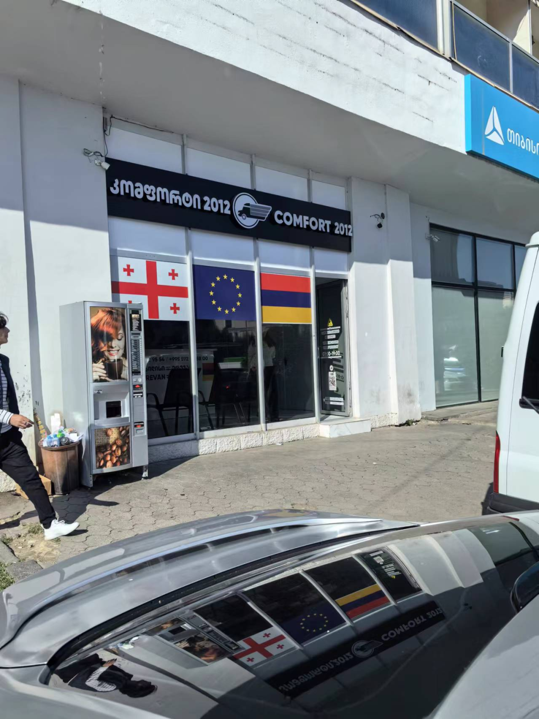 ▲格鲁吉亚去亚美尼亚巴士的乘车点,挂有三种旗帜