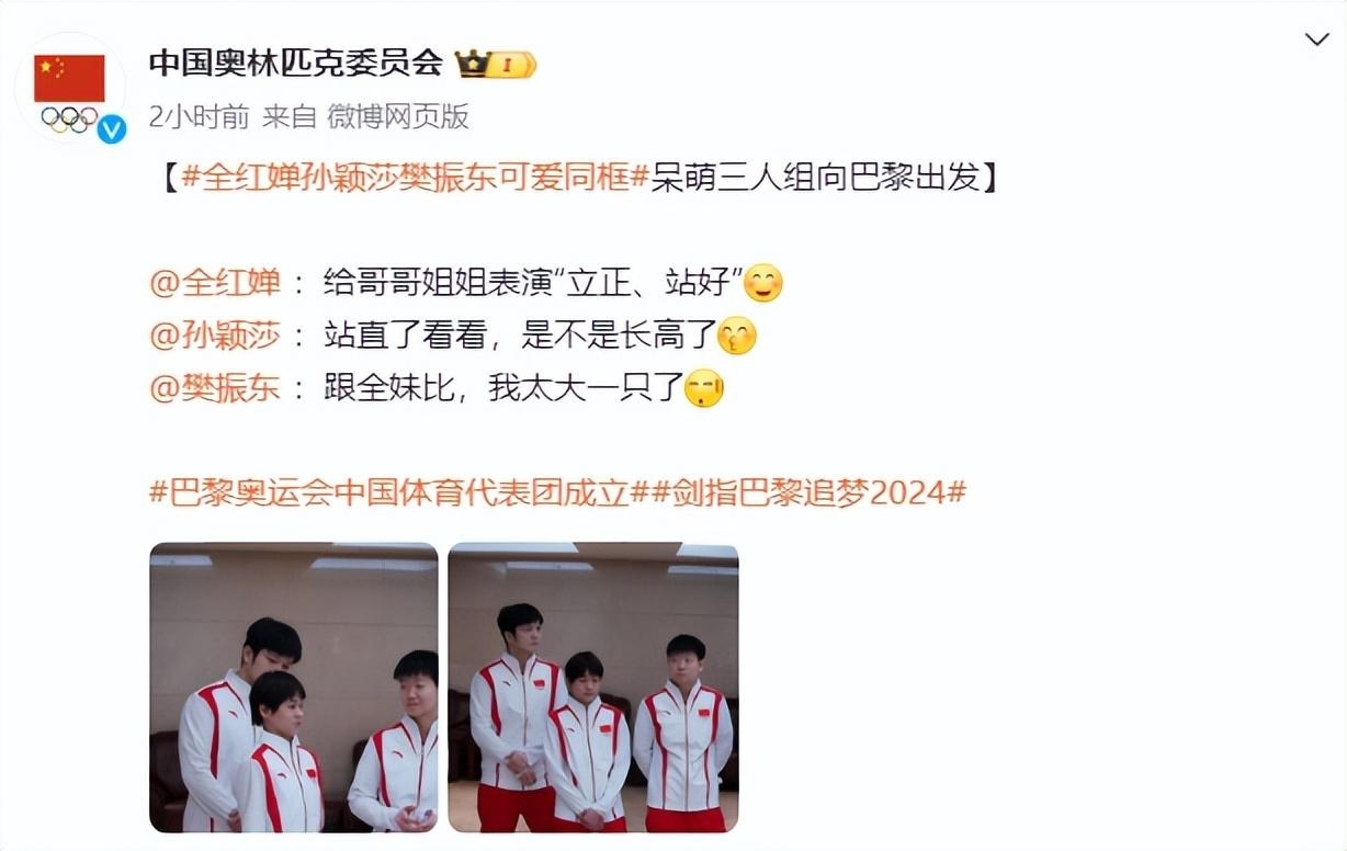 中国奥林匹克委员会为这两张照片配上了非常可爱的文字,“全红婵、孙颖莎、樊振东可爱同框,呆萌三人组向巴黎出发。全红婵 :给哥哥姐姐表演“立正、站好”;孙颖莎 :站直了看看,是不是长高了;樊振东 :跟全妹比,我太大一只了。”