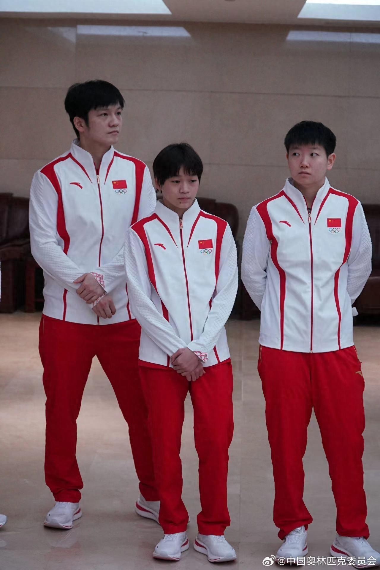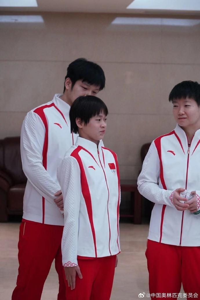 中国奥林匹克委员会官方晒出两张照片,一张照片上三名运动员表情严肃地站立着,樊振东、全红婵将手交叠放在身前,动作神同步,孙颖莎则双手背在背后。