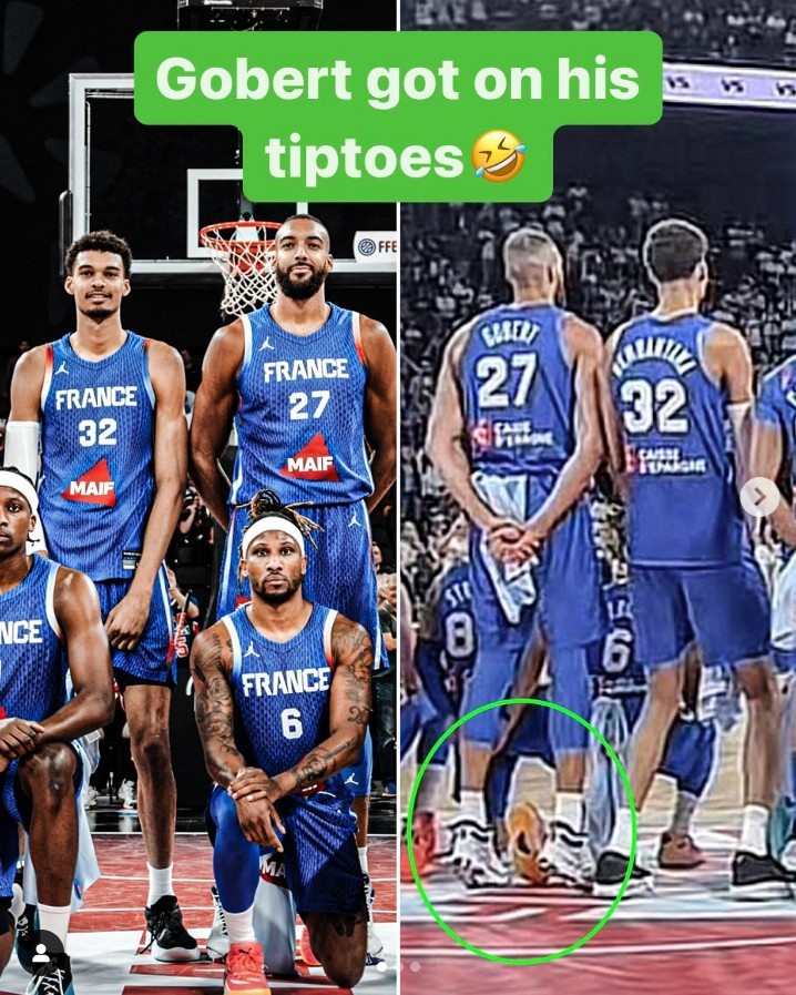 北京时间7月13日,在法国男篮与塞尔维亚的热身赛前,法国男篮合影中,戈贝尔踮起了脚尖,文班亚马则弯下了膝盖,让戈贝尔看起来更高了。