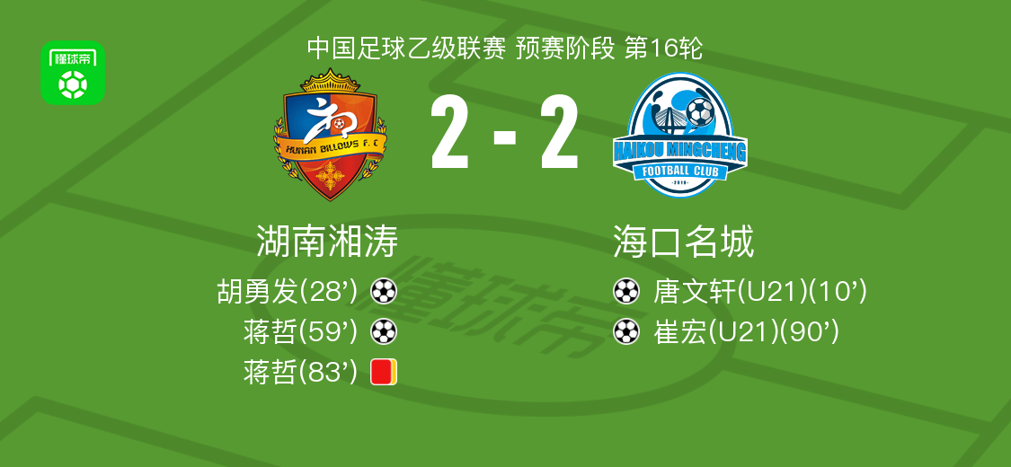 北京时间7月13日,中国足球乙级联赛预赛阶段第16轮,湖南湘涛主场迎战海口名城。比赛中,海口名城的张子立助攻唐文轩率先破门,随后湖南湘涛的胡勇发扳平比分。下半场,湖南湘涛的努艾力-孜明助攻蒋哲再下一城,但蒋哲随后因累计两张黄牌被罚下场。比赛临近结束时,海口名城的张子立再次送出助攻,帮助崔宏打入关键一球。最终,双方以2-2握手言和。
