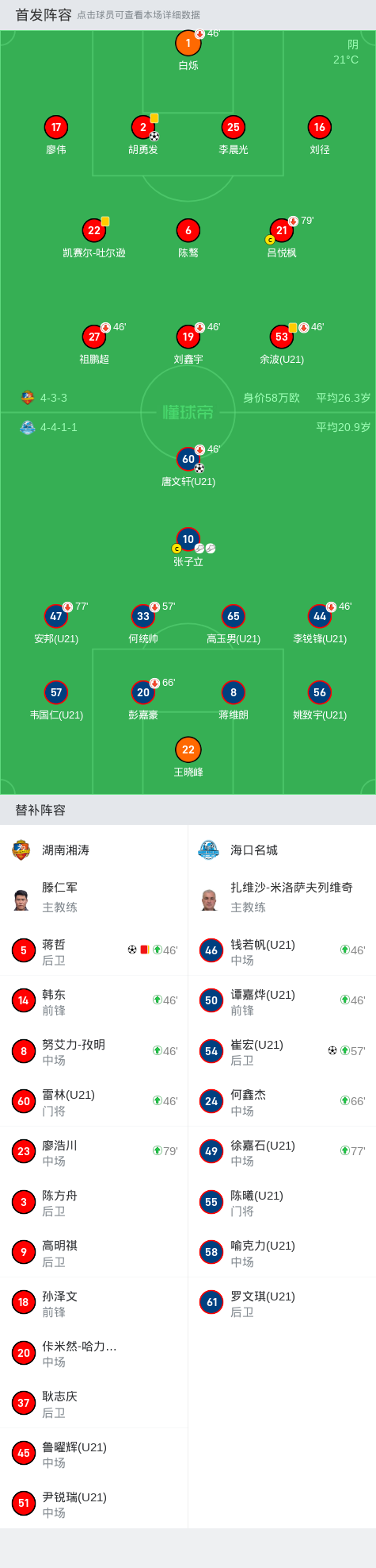 第28分钟,比分扳平,胡勇发后点跟进垫射破门,湖南湘涛1-1