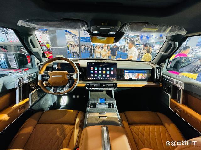 也许有人看到猛士富有肌肉感的外观,就会不知不觉产生一种想法:它太硬派,不便于日常出行。其实,猛士 917 外表硬朗,内里却很“柔和”。全液晶仪表、中控屏幕、副驾娱乐屏、HUD 抬头显示与流媒体后视镜,五屏联动科技感十足。带有菱形纹路的真皮座椅具有按摩、加热、通风功能,再加上“手枪”形状的车门把手以及机械码表样式的挡位显示,仪式感满满。